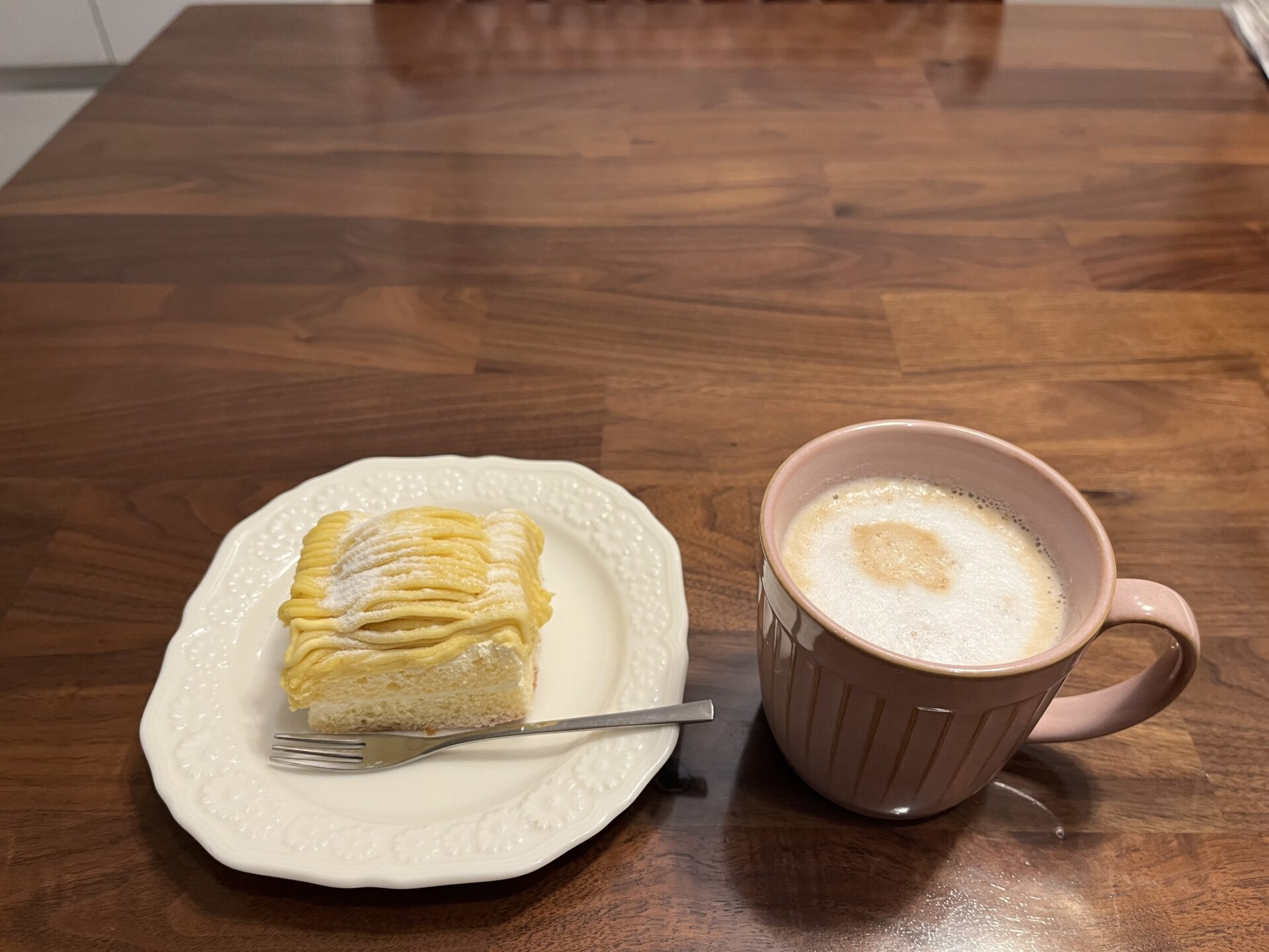 帰りにケーキを買い、バリスタでラテを淹れて一緒に食べた。