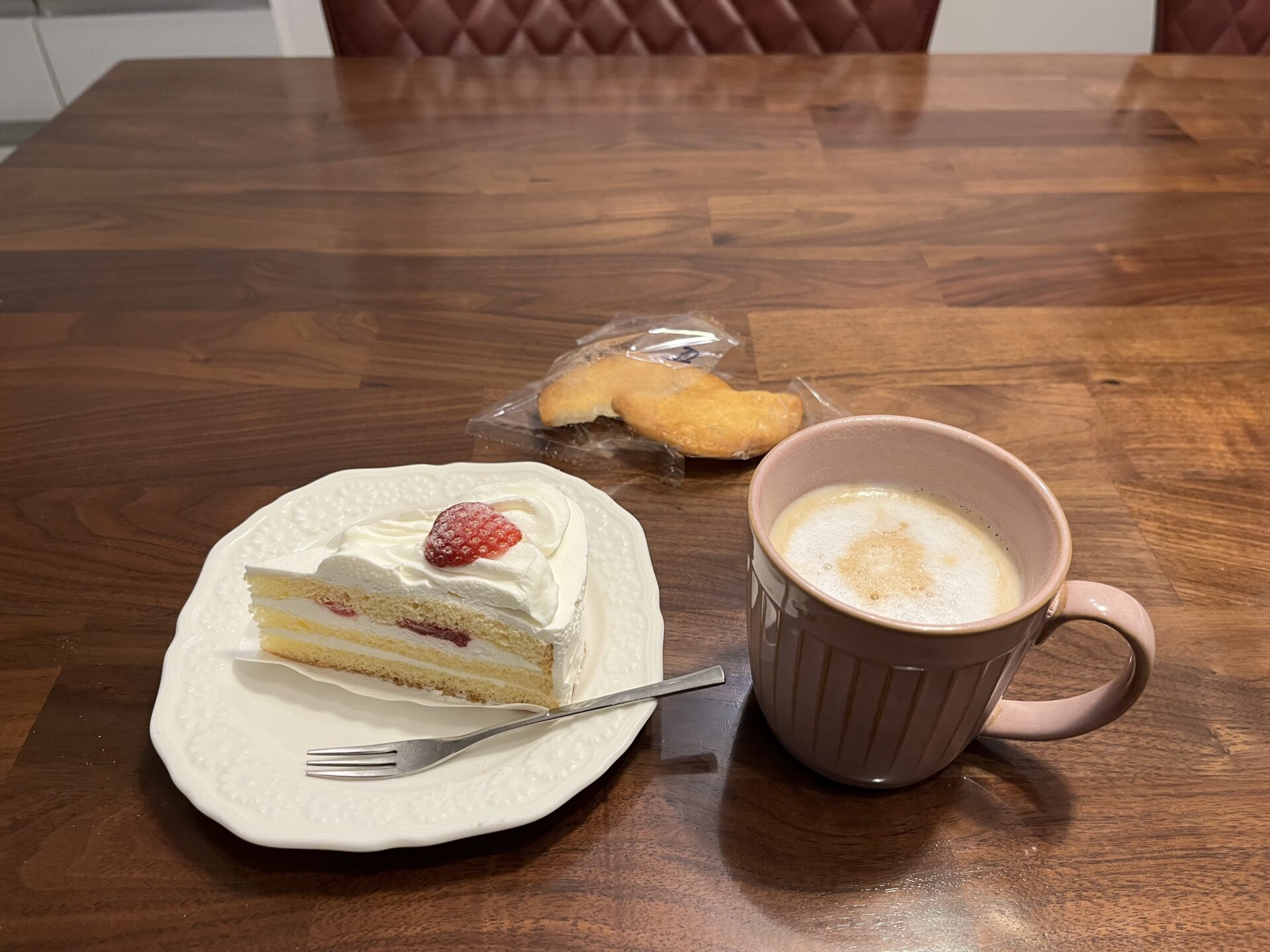 固焼きせんべいとスーパーで買ったショートケーキ、バリスタで淹れたカフェラテと