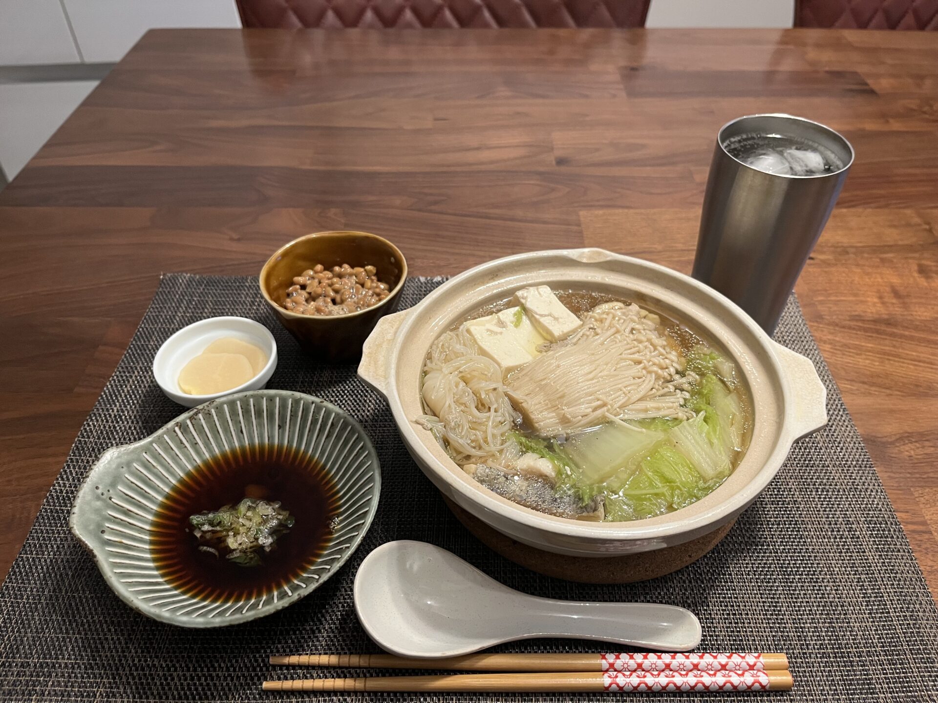鍋の具は、白菜、えのき、結びしらたき、鶏もも肉、鱈、豆腐