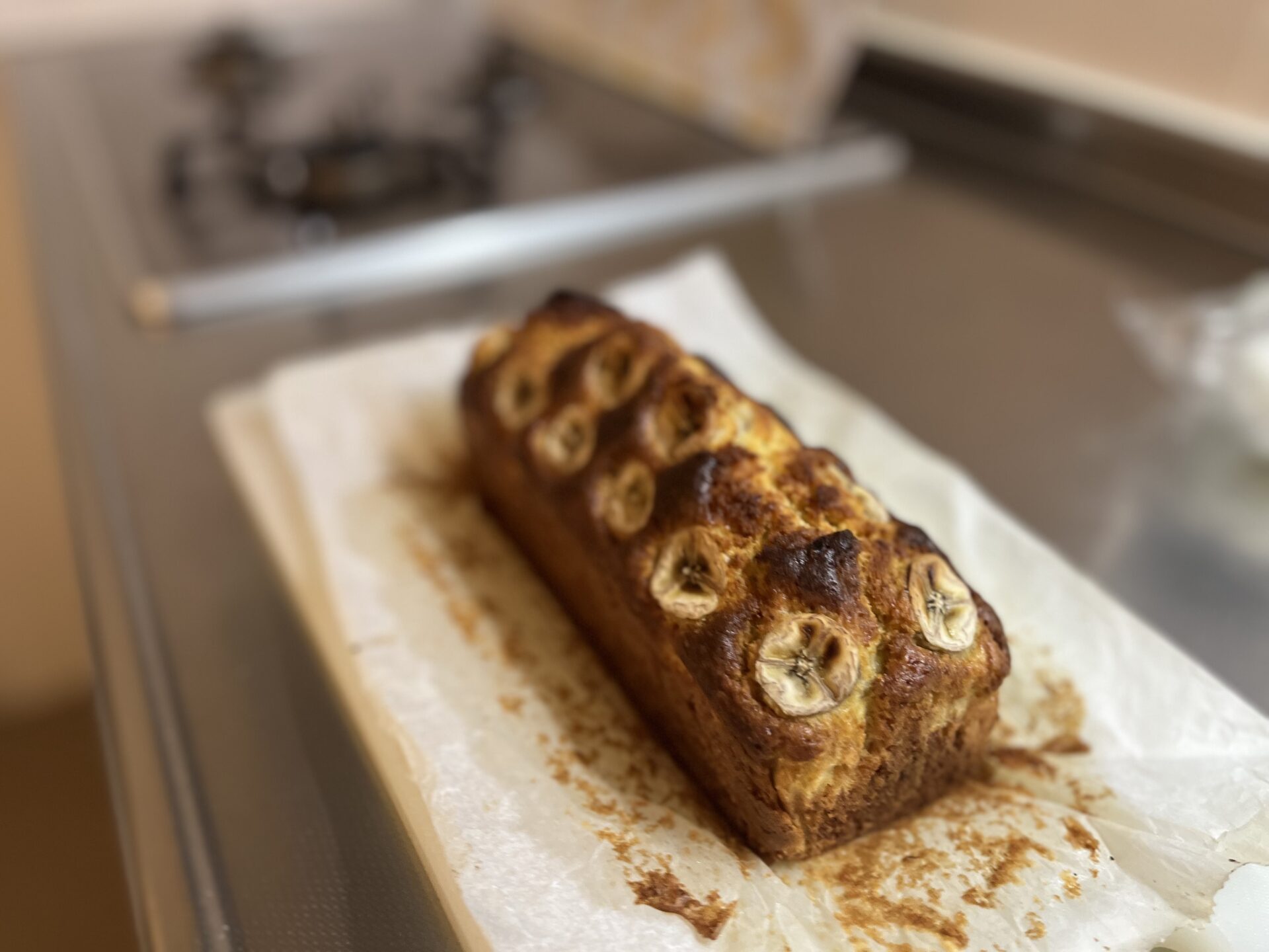 今朝、ホットケーキミックスで作るバナナパウンドケーキを作った。