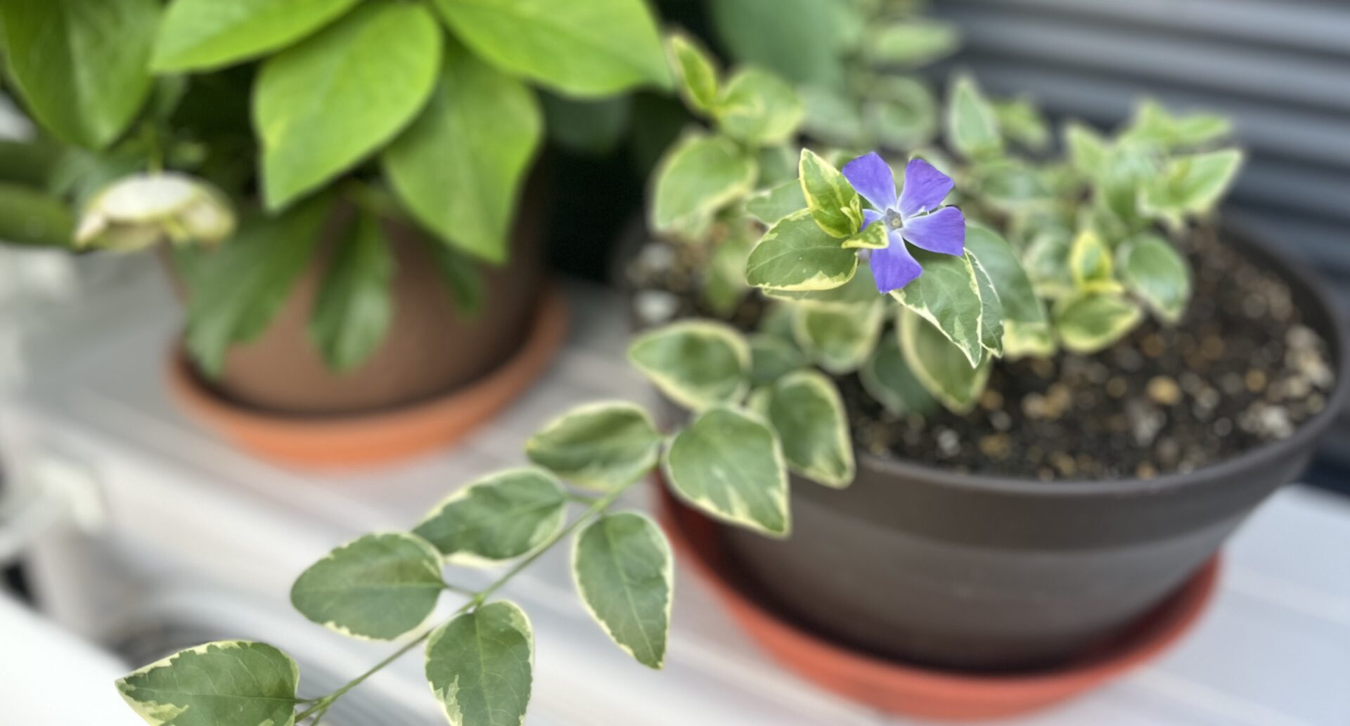 クリスマスローズはこのまま半日陰で夏越し、ツルニチニチソウは根付いたら日向に移す。