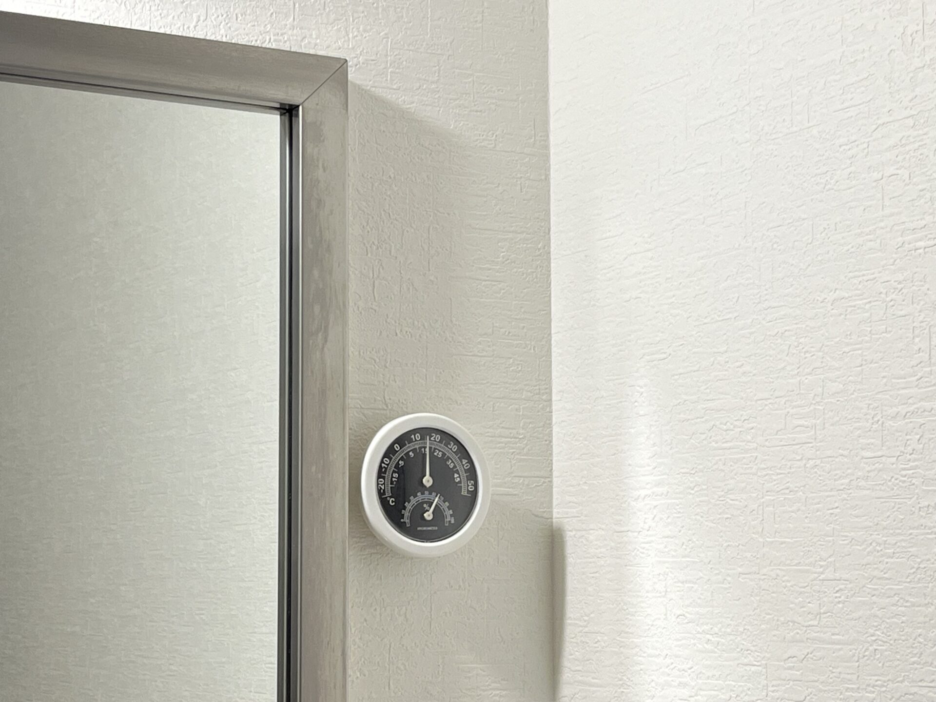 元々キッチンの壁につけていた100均の温湿計は脱衣室の壁に移動した。