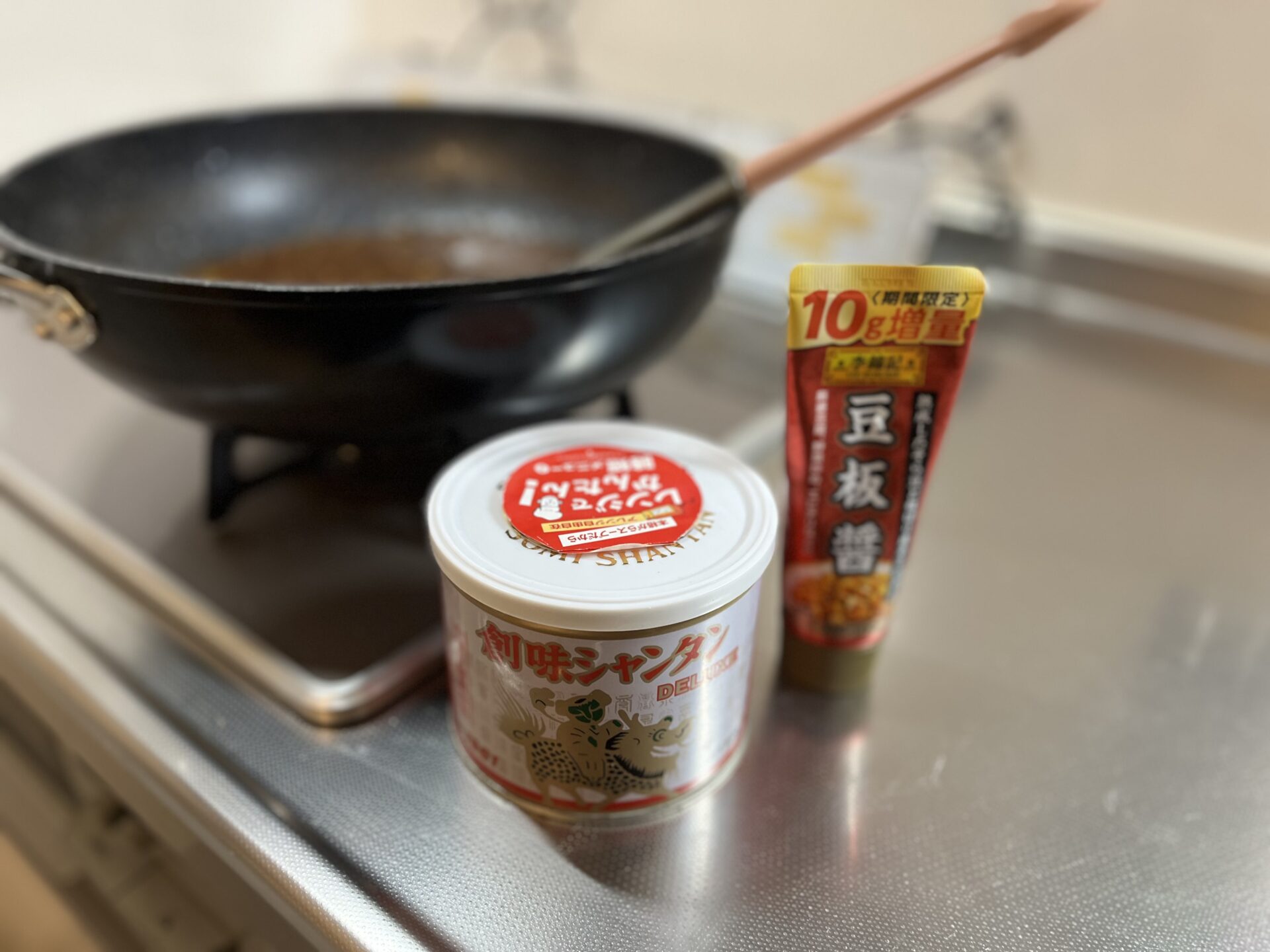 今日、スーパーでにんにくと豆板醤を買い、あとはうちにある調味料で足りた。